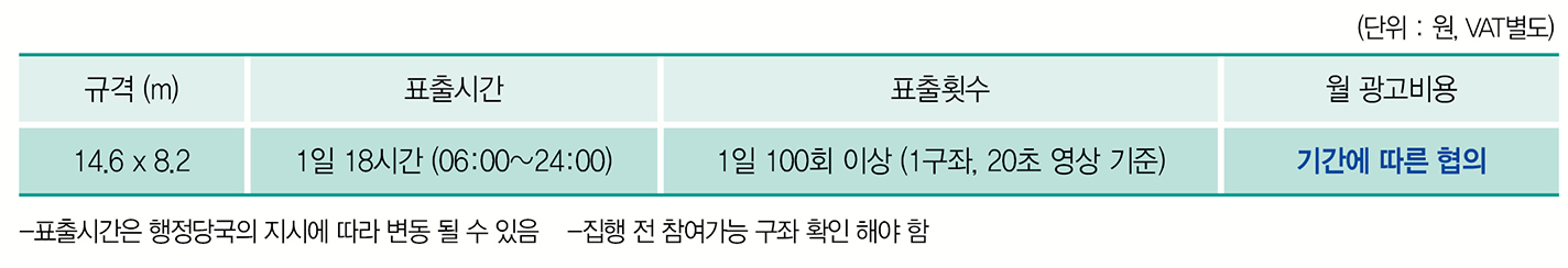 ▷동 매체는 서울역 부근에 위치, 내국인 및 외국인 관광객 등 유동인구와 상주 인구 밀집 지역이기에 대외적인 이미지 제고에 큰 효과가 있음.